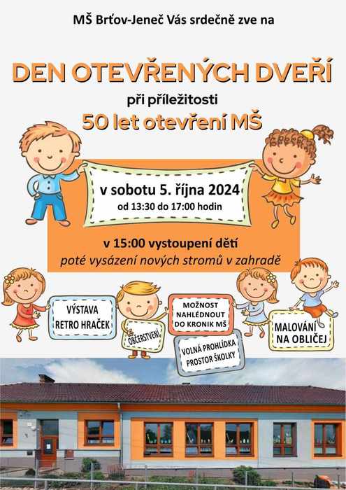 MŠ Brťov-Jeneč Vás srdečně zve na DEN OTEVŘENÝCH DVEŘÍ při příležitosti 50 let otevření MŠ.