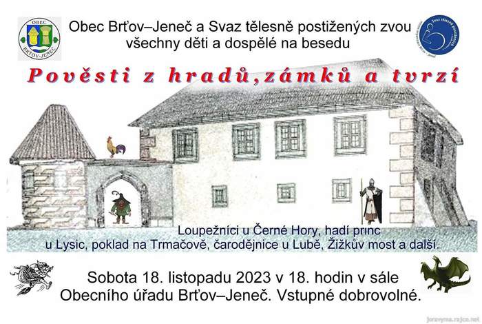 Obec Brťov–Jeneč a Svaz tělesně postižených zvou všechny děti a dospělé na besedu Pověsti z hradů, zámků a tvrzí. Loupežníci u Černé Hory, hadí princ u Lysic, poklad na Trmačově, čarodějnice u Lubě, Žižkův most a další. Sobota 18. listopadu 2023 v 18. hodin v sále Obecního úřadu Brťov-Jeneč. Vstupné dobrovolné.