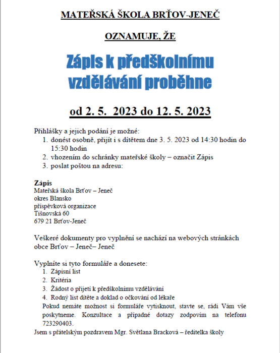 Úvod > Život v obci > Aktuality > Zápis k předškolnímu vzdělávání
