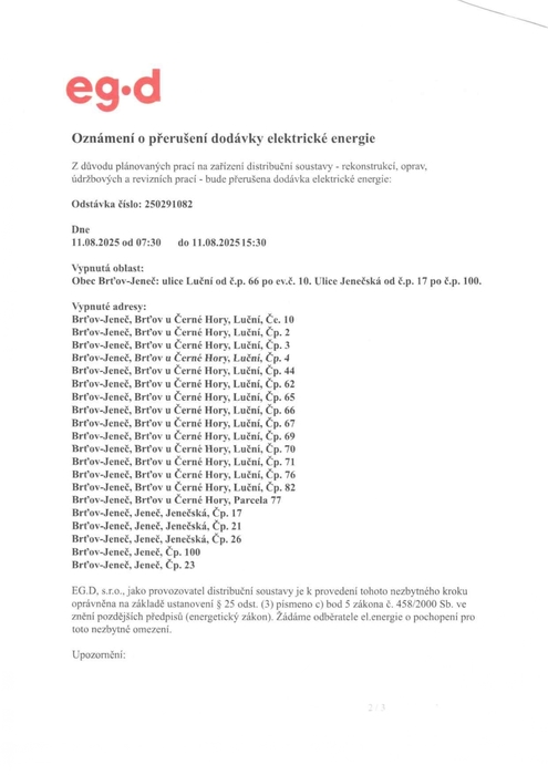 Oznamujeme, že dne 11.8.2025 od 7:30 hod. do 15:30 bude z důvodu plánovaných prací na zařízení distribuční soustavy přerušena dodávka el. energie.